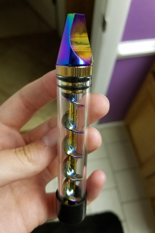 The spiral goes inside the glass tube and used as a screw for pushing the weed down, make sure that the device is filled compactly.